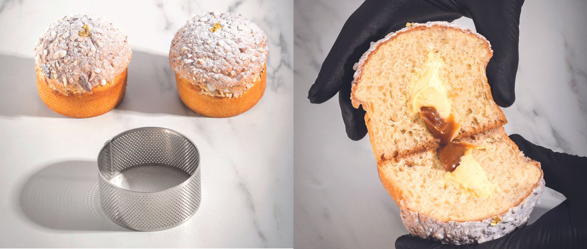 Prelevare 70 g di pasta brioche e formare delle palline. Inserire le palline all’interno delle fasce XF53 e riporre in una stufa di lievitazione a 26ºC per 2 ore. Dressare al di sopra di ogni preparazione la glassa macaronade alle mandorle. Cuocere in forno ventilato a 145°C per 15-20 minuti. Lasciar raffreddare sulla griglia prima di smodellare. Guarnire con crema alla vaniglia al centro (30 g), poi con caramello salato. Finire con una spolverata di zucchero a velo.