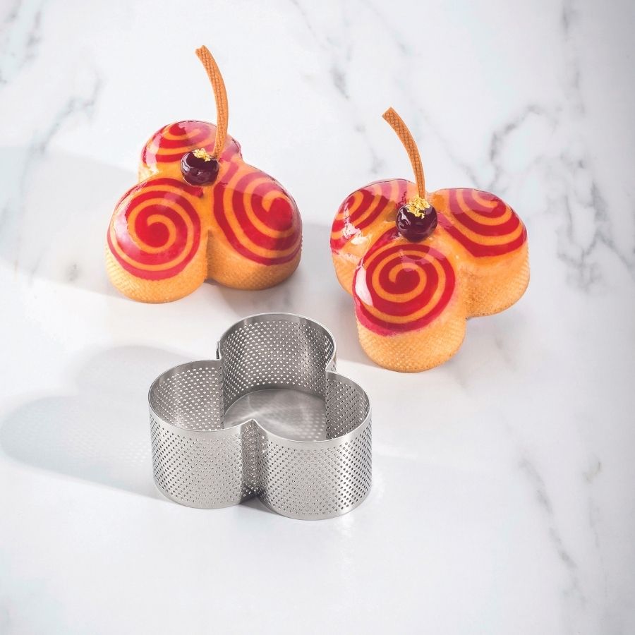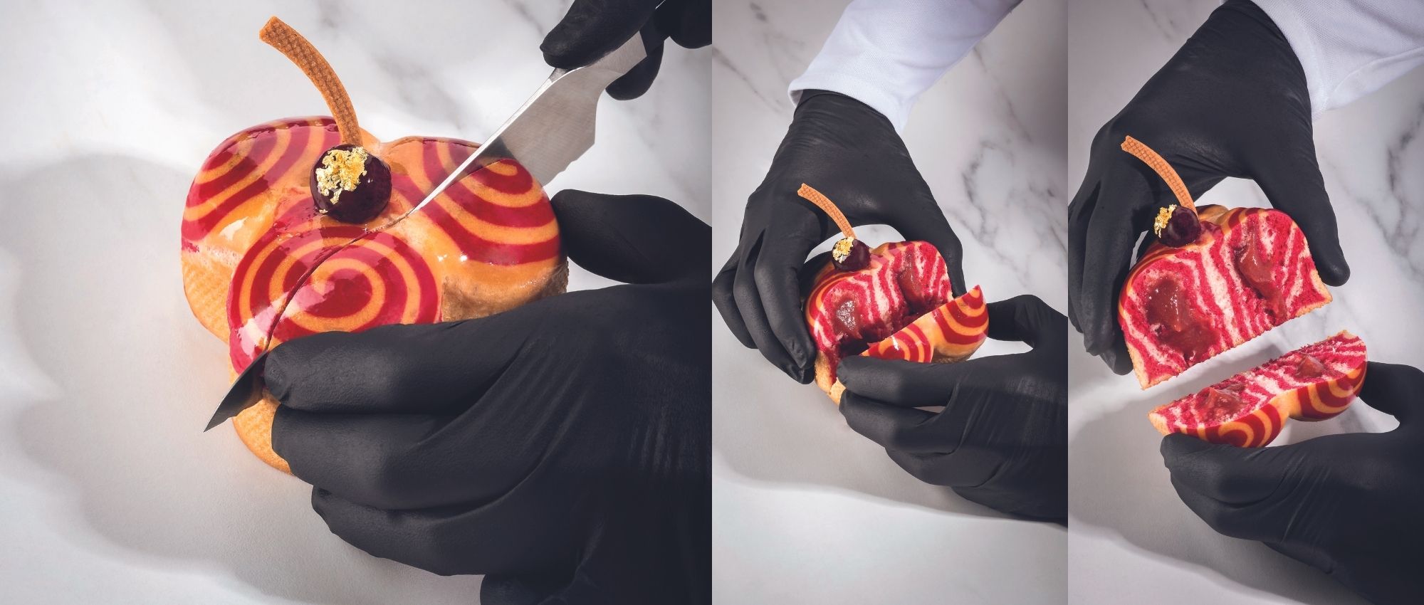 Dividere in panetti la pasta per il pane al latte naturale in 3 e quella alla ciliegia in 2 alternando uno strato per ogni colore. Sovrapporre ogni strato con un po’ d’acqua e stenderlo con la laminatrice a 3 mm di spessore. Congelare 20 minuti prima di tagliare le strisce. Arrotolare le strisce ricavate e metterne tre rotolini bicolore nella fascia XF54; uno per ogni petalo. Far lievitare in una stufa di lievitazione a 28ºC per circa 2 ore. Quindi cuocere in forno ventilato a 140ºC per 15-20 minuti. Lucidare con sciroppo e far raffreddare. Farcire con la confettura di ciliegia e decorare con una foglia d’oro.