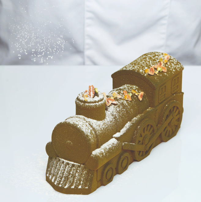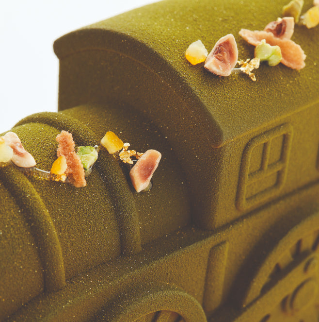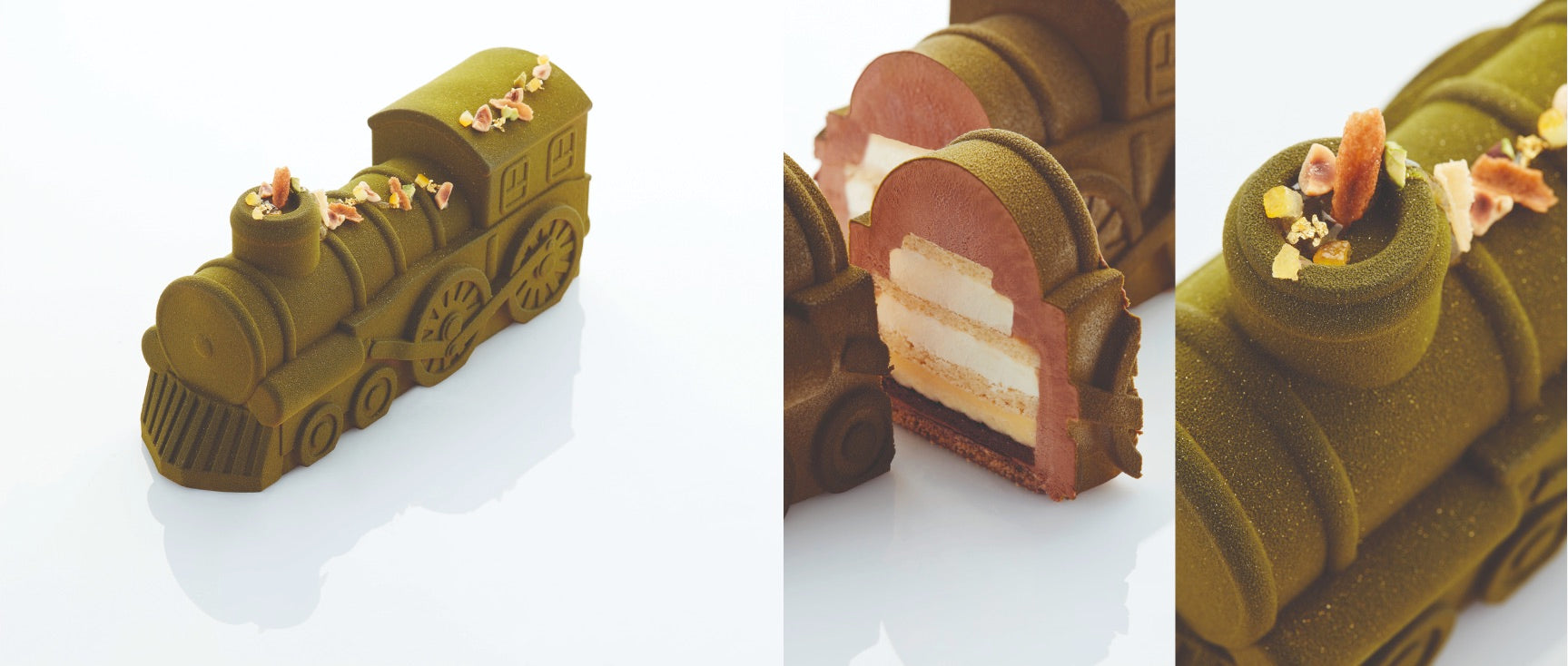 All'interno dello stampo KE011 inserto porre uno strato di pan di spagna al cioccolato sopra il crumble e versarvi il cremeux agli agrumi. Lasciare riposare in frigorifero prima di aggiungere un primo strato di biscotto joconde. Montare la ganache alla cannella e stenderla sul composto, infine inserire un altro strato sopra il biscotto joconde. Abbattere il preparato. Dressare la mousse al cioccolato nello stampo KE085 Express Log e posizionare all'interno l'interno smodellato dallo stampo KE011. Mettere lo stampo KE085 Express Log in abbattitore e dopo il congelamento spruzzare con il colore al burro di cacao verde di Pavoni LB01SB.