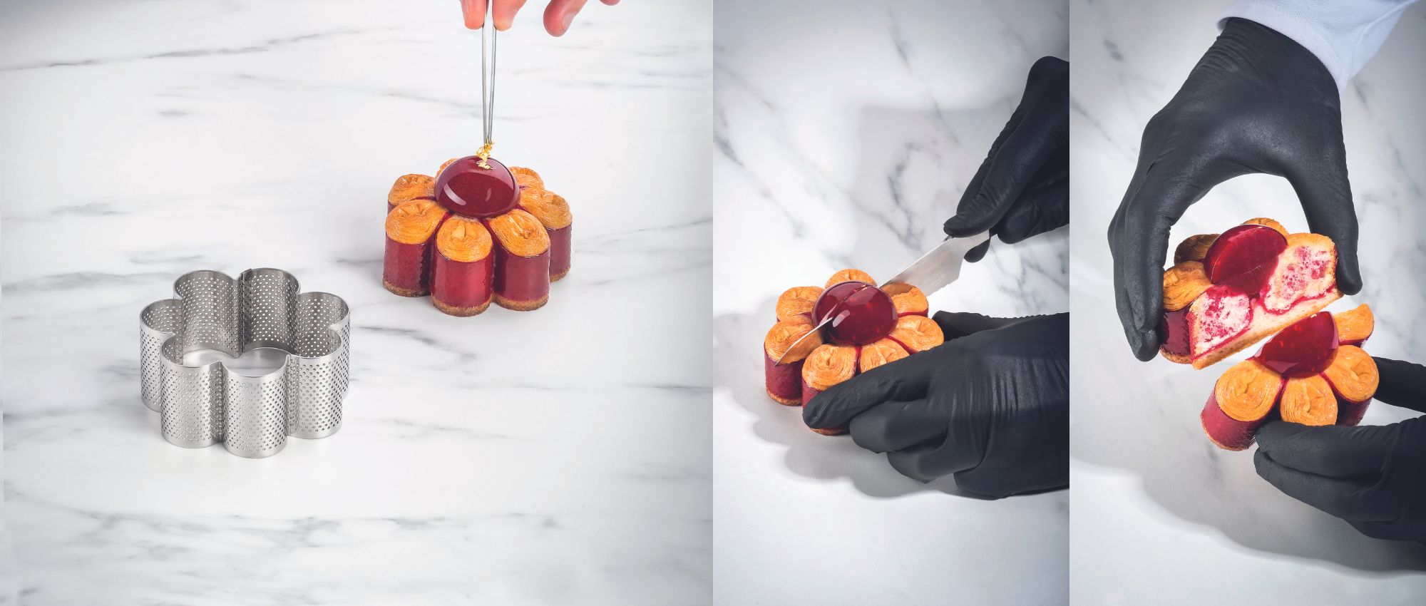 Realizzare la pasta croissant tradizionale e sovrapporre la seconda pasta colorata. Stendere a 3 mm di spessore e ricavare delle strisce di 7x2,5 cm. Ripiegare in due 7 strisce di pasta conservando la parte rossa sull’esterno. Mettere a lievitare nella fascia XF51 in cella di lievitazione a 27ºC per 1 ora e mezza. Disporre l’inserto di confit congelato al centro e cuocere in forno ventilato a 165ºC per 20 minuti. Lucidare dopo la cottura con lo sciroppo e quindi lasciare raffreddare. Immergere le semisfere di composta di lampone nella glassa neutra, e posare al centro della creazione. Decorare con foglia oro.