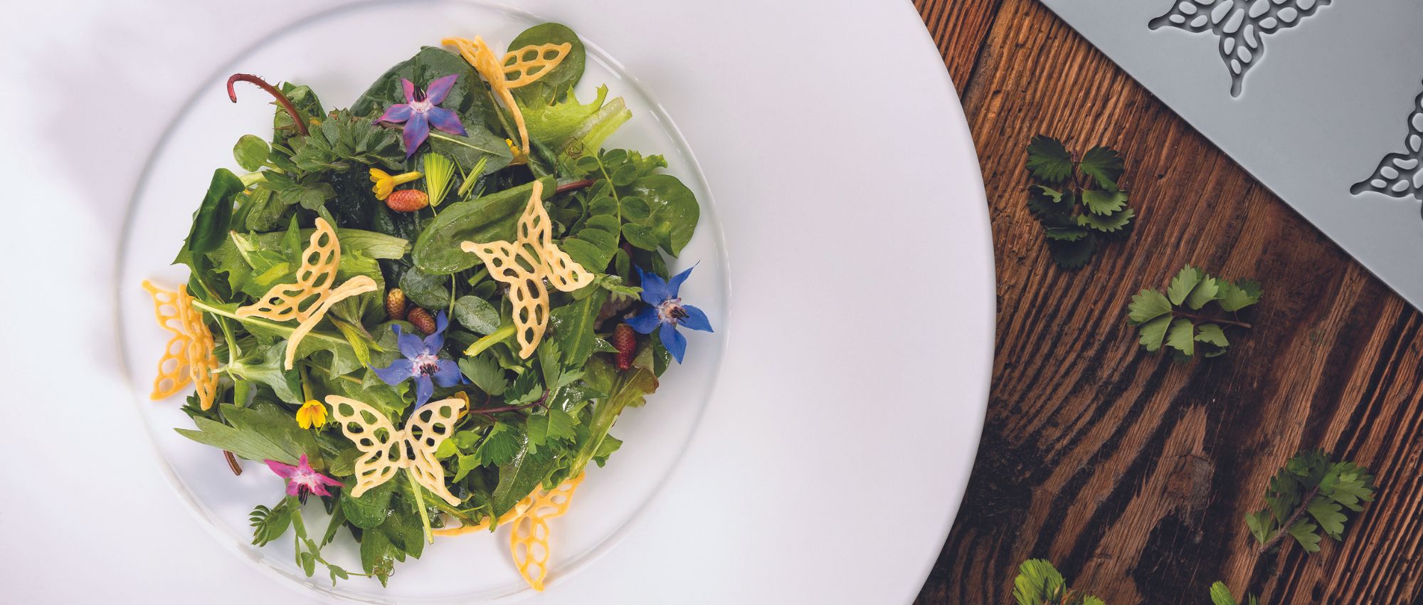 Disporre nel piatto l’insalata con le erbe aromatiche, i pop corn di amaranto e finire con le cialde di fontina.