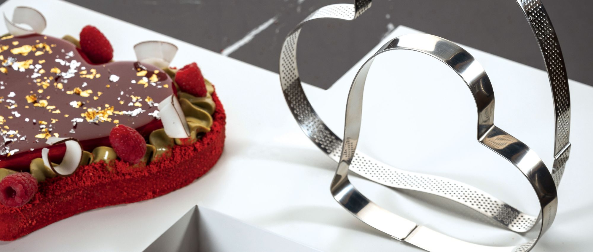 Montare la ganache montata al cocco, far cristallizzare in frigorifero. Con una sacca da pasticceria munita di bocchetta Saint Honoré dressare i bordi. Posizionare il decoro.