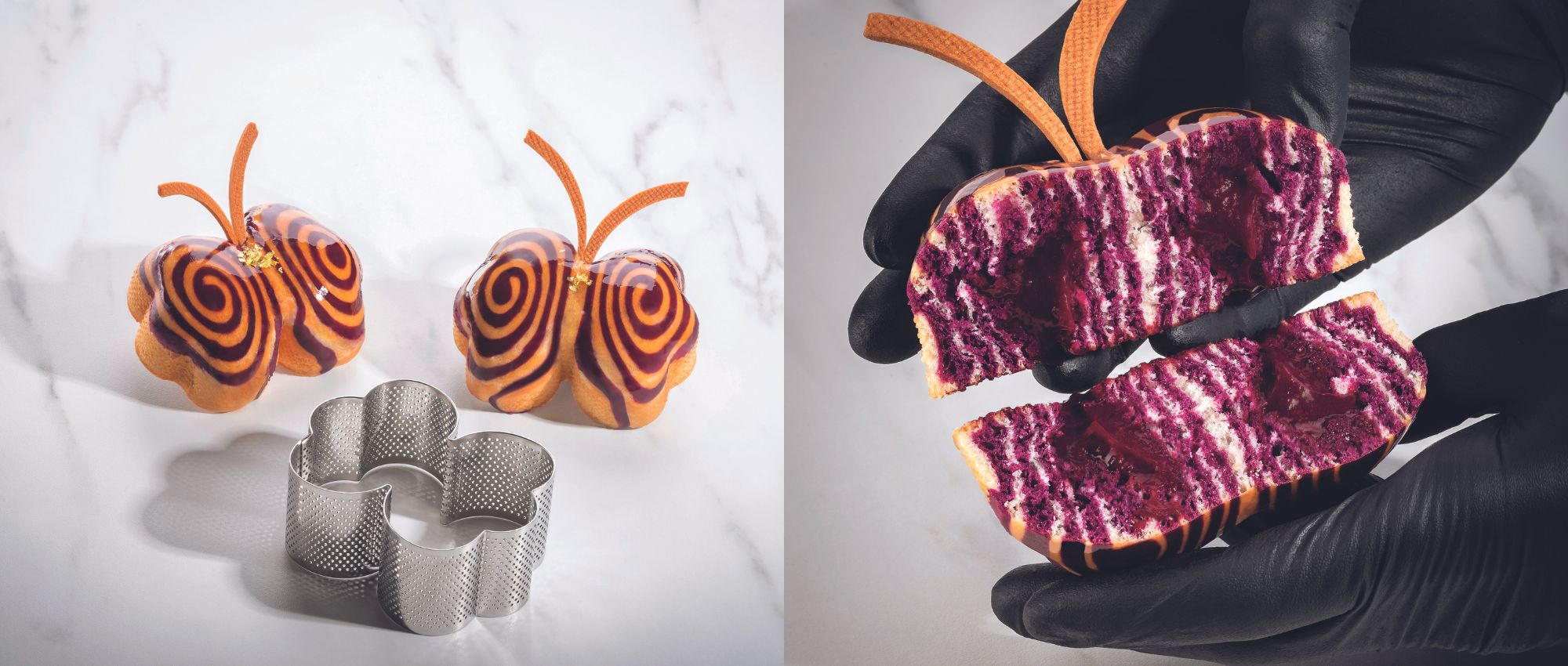In planetaria mixare tutti gli ingredienti. La pasta deve essere ad una temperatura di 22/24°C. Lasciare riposare a temperatura ambiente circa un’ora e poi mettere in frigorifero per 12 ore. Il giorno dopo stendere le due paste (naturale e viola) a 4 mm. Congelare prima di laminare a 3 mm la massa bicolore. Lasciare in congelatore 20 minuti prima di tagliare. Arrotolare le strisce e tenere la parte bianca all’esterno. Tagliare a metà e mettere le due metà una di fianco all’altra. Lasciare riposare l’impasto prima di pressare al centro e formare una farfalla. Inserire nella fascia microforata XF55. Metter tutte le fasce su FOROSIL64 e lasciare lievitare in cella a 26°C 2 ore circa, prima di cuocere a 140°C per circa 18-20 minuti. Raffreddare sulla griglia dopo la cottura.