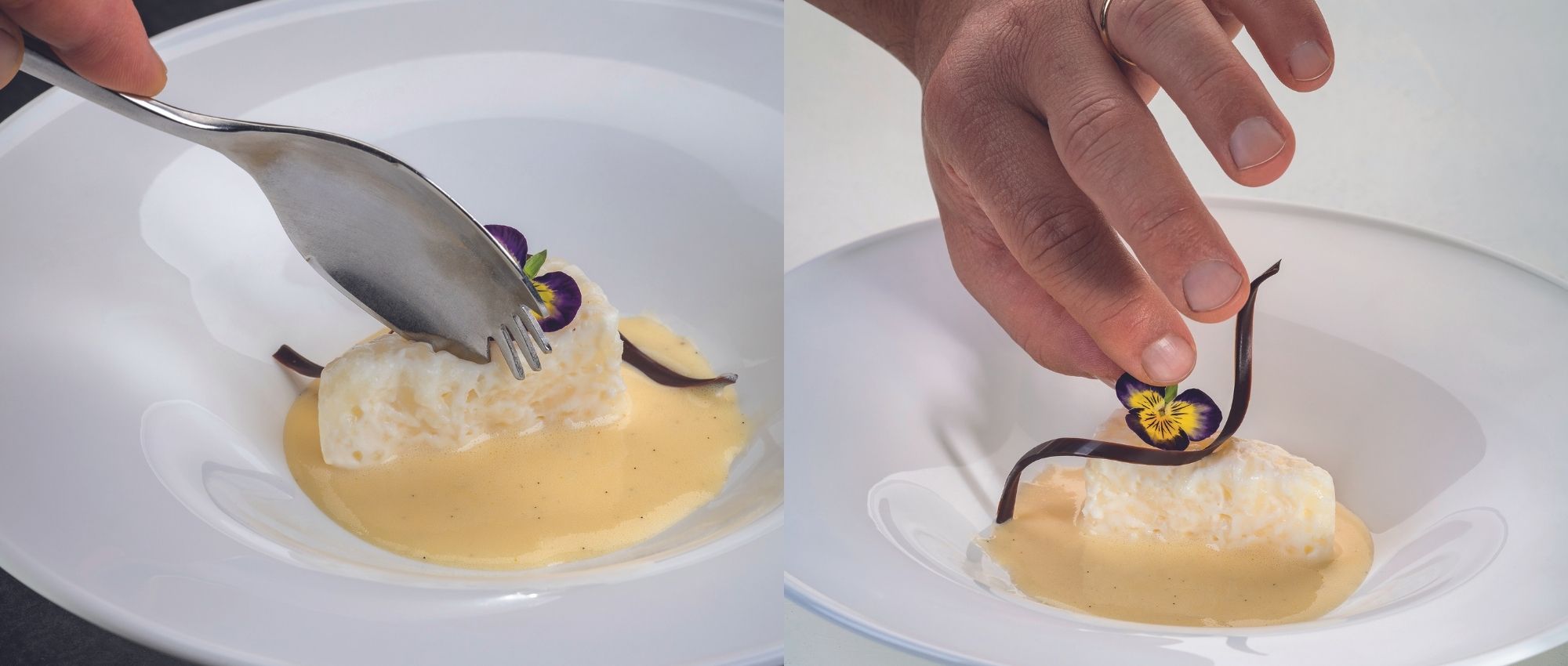 Disporre la salsa al centro dei piatti, poi il riso ed infine un ricciolo di cioccolato e i fiori eduli.