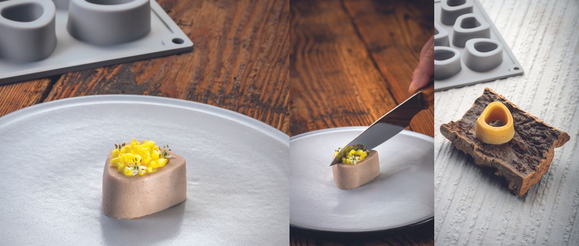 Frullare tutti gli ingredienti, setacciare, dividere il composto negli stampi e cuocere in forno a vapore a 85°C per 20 min. Far raffreddare.