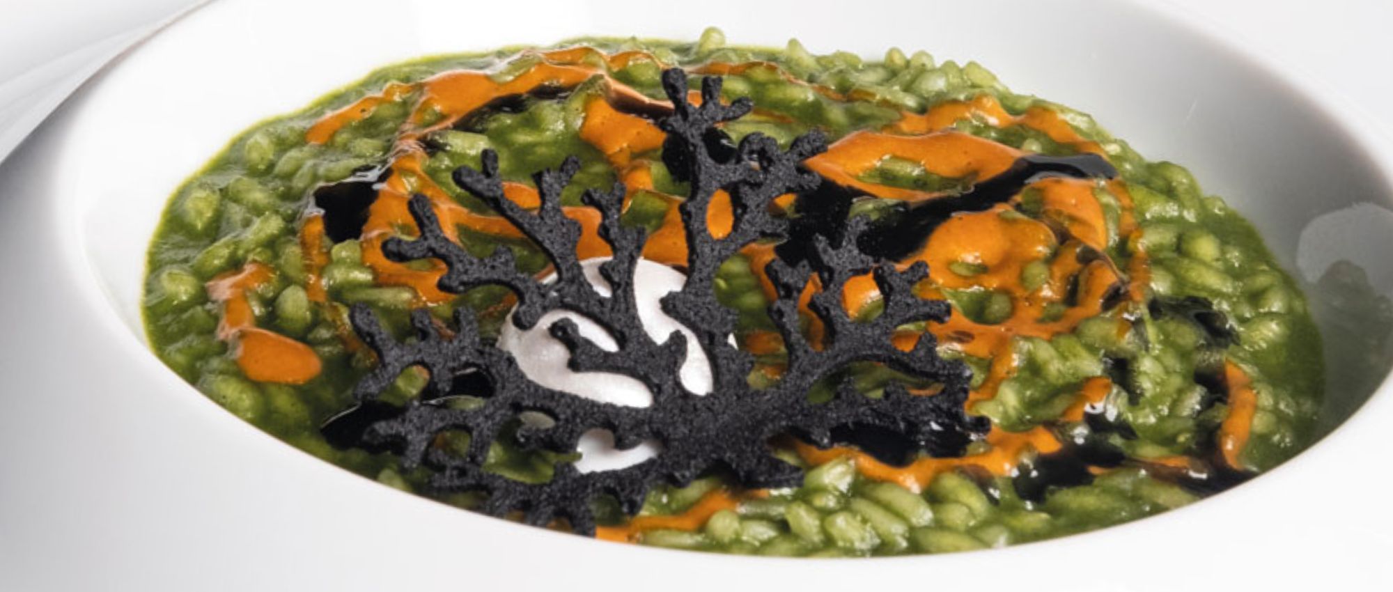 Cuocere il riso bagnandolo con il brodo vegetale, a 3/4 di cottura unire la spirulina disciolta in poco brodo e terminare la cottura mantencando con l'olio. Disporre nel piatto il risotto. Condire il dripping di ricci di mare, plancton e aglio nero. Finire con la cialda di nero di seppia.