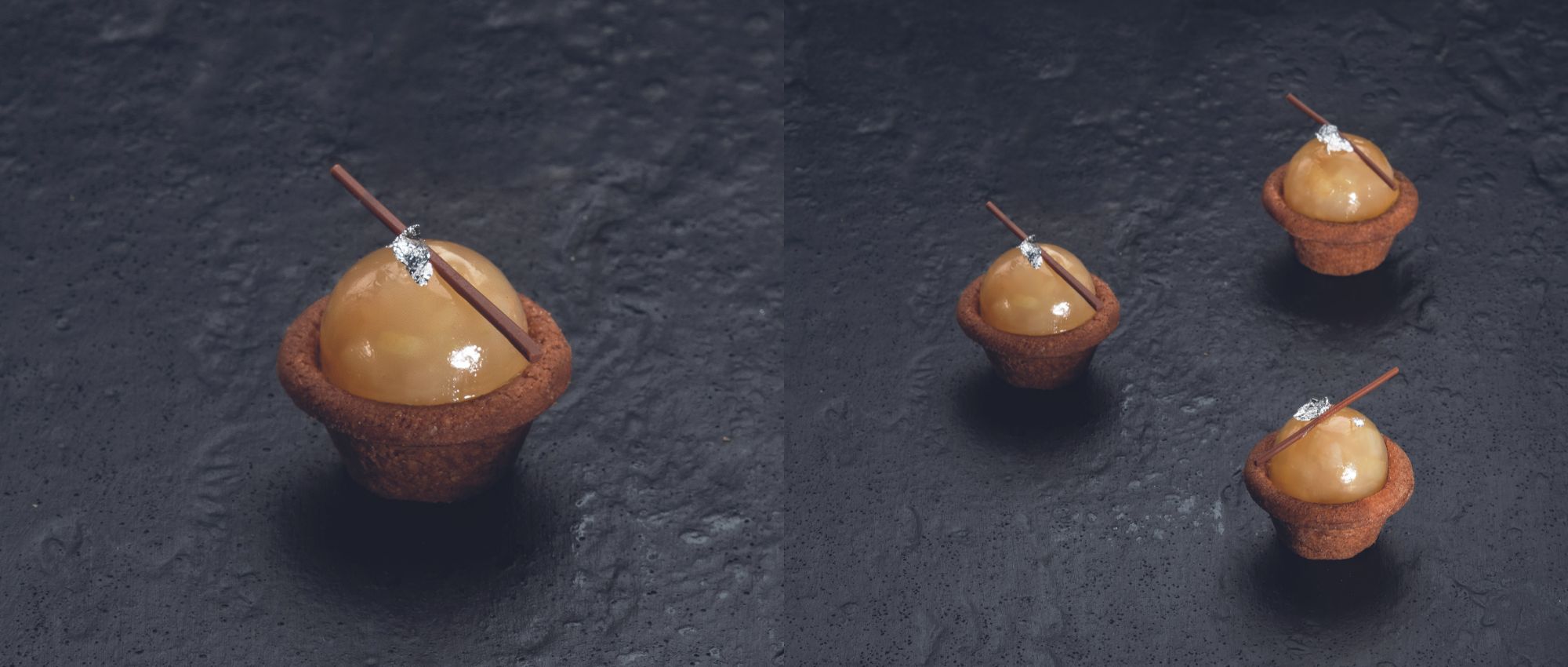 All'interno di una frolla al cacao già cotta mettere una base di pere gelificate congelate. Scongelare il prodotto e decorare.