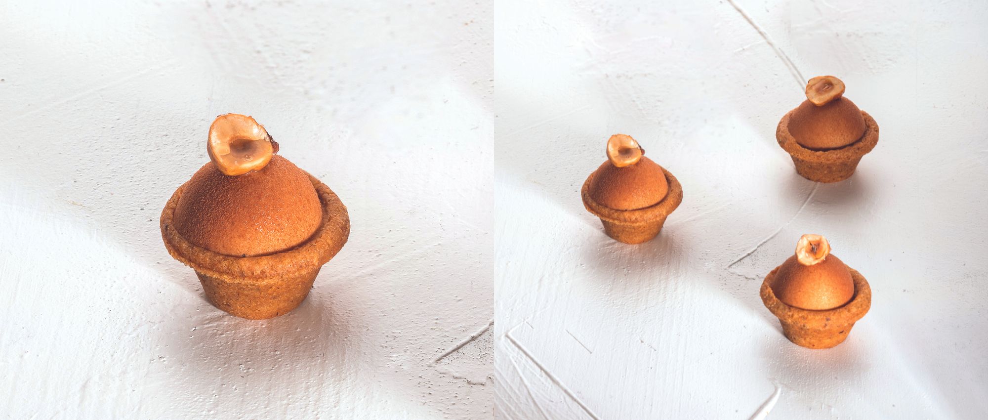 All'interno di tartellette di frolla alla nocciola mettere alla base di cremoso cioccolato al latte stabilizzato in frigorifero (temperatura ideale di colaggio 40°C) smodellare le semisfere di bavarese, spruzzare con effetto velluto e posizionarle sopra il cremoso sulla tartelletta.