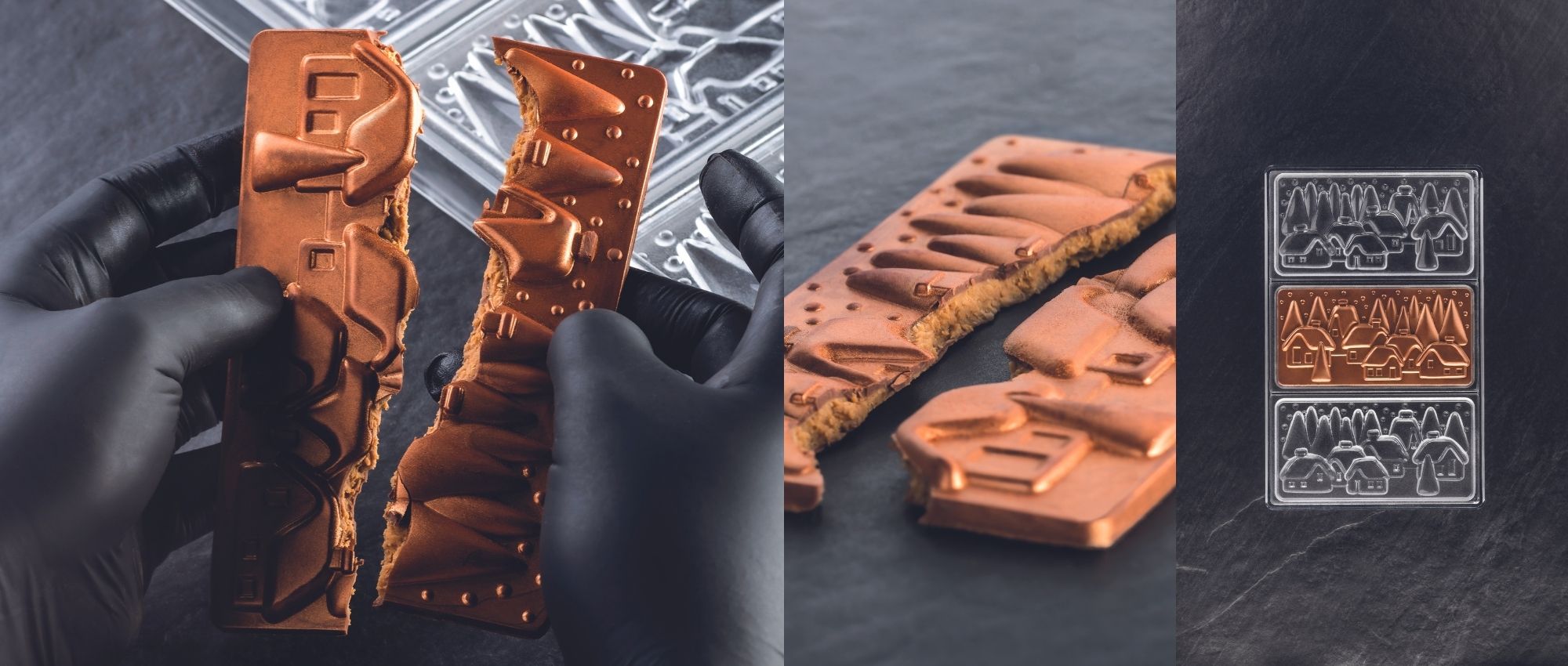 Frullare finemente l’ eclat d’or e la polvere di liquirizia. Temperare il cioccolato ed aggiungere la pasta di noce. Finire con la parte croccante. Riempire le camicie precristallizate dello stampo PC5038.