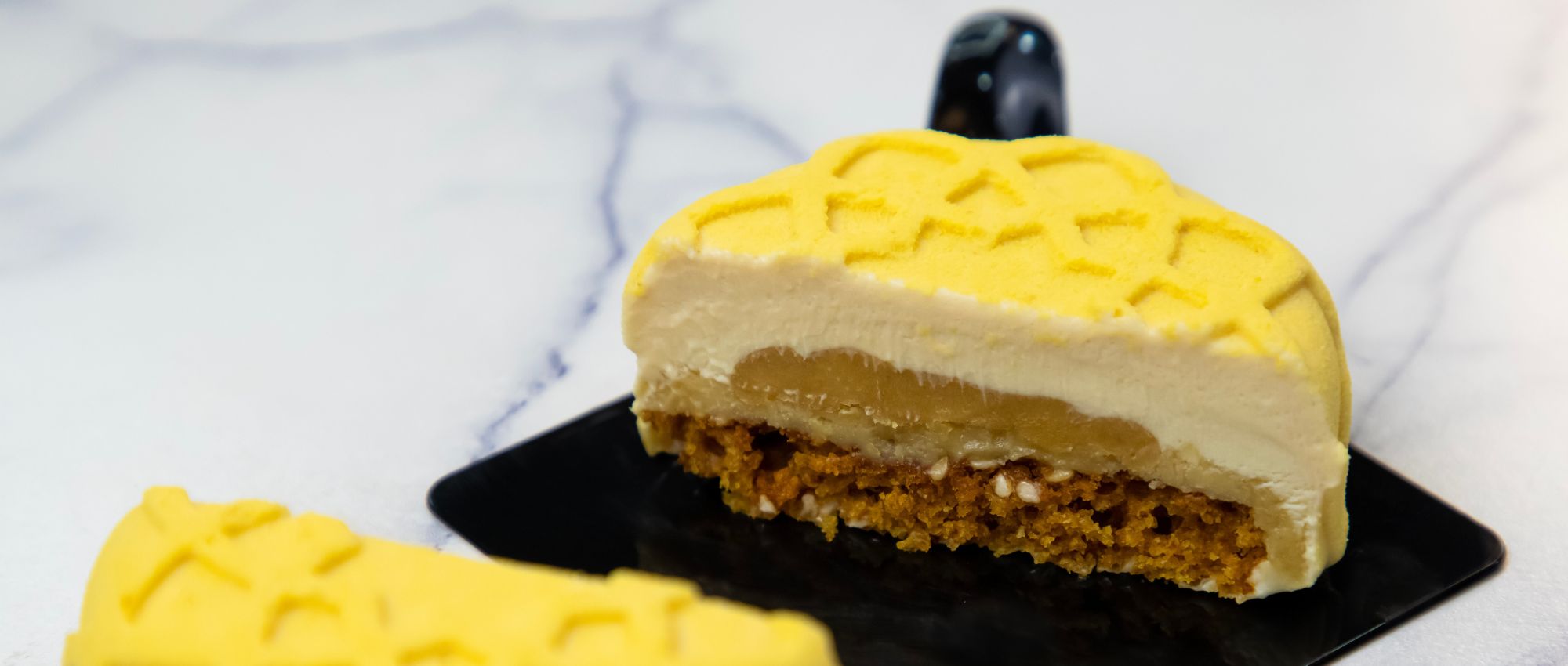 Prepare the mold: Use the Pavoni PAVOFLEX "DAHAB" PX43120 silicone mould. Make sure the mould is clean and slightly cooled to facilitate layering. First layer – Pastry Cream: Pour a layer of pastry cream into a smaller insert. Freeze until completely hardened (this step helps to create a layered insert inside the mousse). Once frozen, unmould and store in the freezer until ready to use. Mousse layer: Pour or measure the caramel mousse into the Pavoni PAVOFLEX "DAHAB" PX43120 mould up to halfway. Tap the mold gently to eliminate air bubbles. Insert the frozen pastry cream insert into the center of the mousse layer. Press lightly to immerse it, but do not push it too far down. Add more caramel mousse until the mould is almost full. Level the surface with a spatula. Cut the milk sponge cake into discs the size of the mould. Place a sponge cake disc on top of each filled mould (this will be the base once turned upside down). Press gently to make it adhere to the mousse. Freeze the assembled dessert completely to make it easier to unmould and apply the spray.