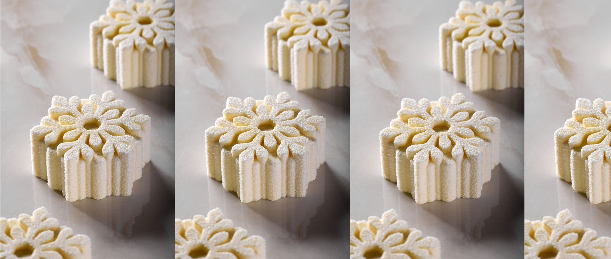 Prepare the silicone mold. Pour the white chocolate into each cavity and shake off the excess. Let it cool in the refrigerator. Assemble in reverse order, following this order: