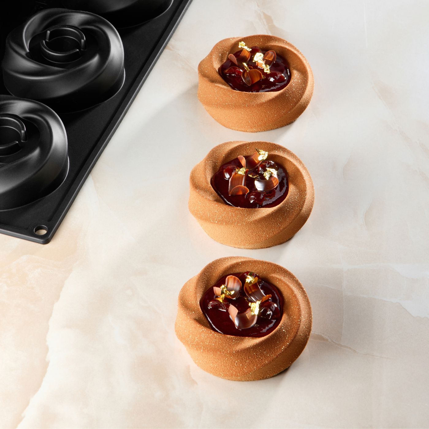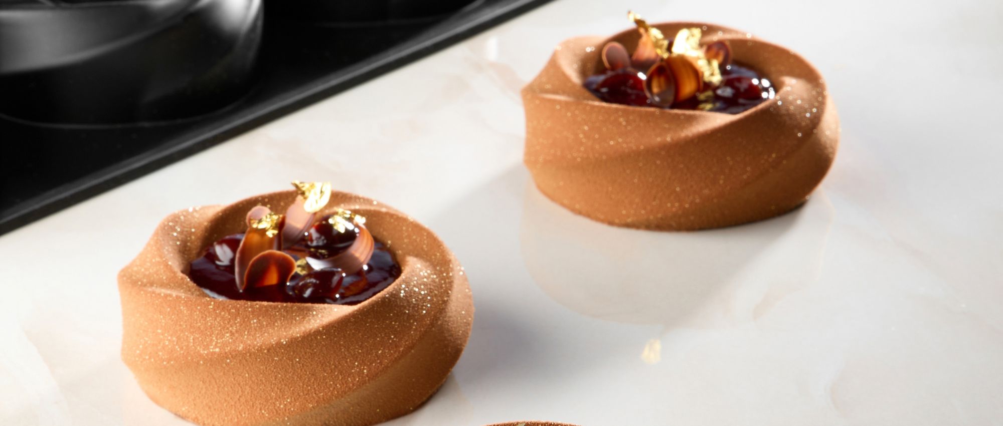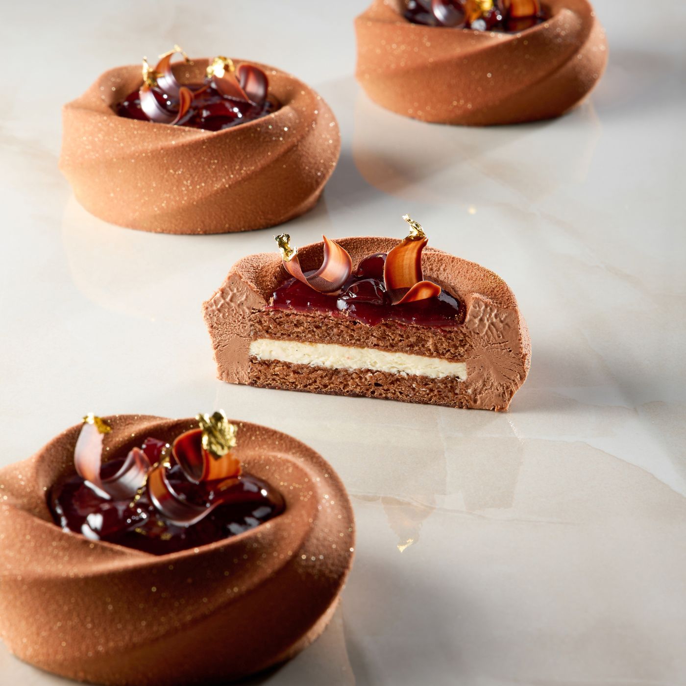 Place a soaked sponge cake disc on the SPV Pavoni. Dress over the mascarpone mousse. Place a second soaked sponge cake disc and freeze. Pipe the chocolate mousse into the Karma Pavoni mold with a piping bag. Insert the frozen inside and freeze in a blast chiller. Unmold and spray with chablon paste. Spray a light coat of Pavoni Gold Stardust. Dress the inside of the cavity with a layer of cherry jam. Decorate with candied cherries, chocolate petals and gold leaf.