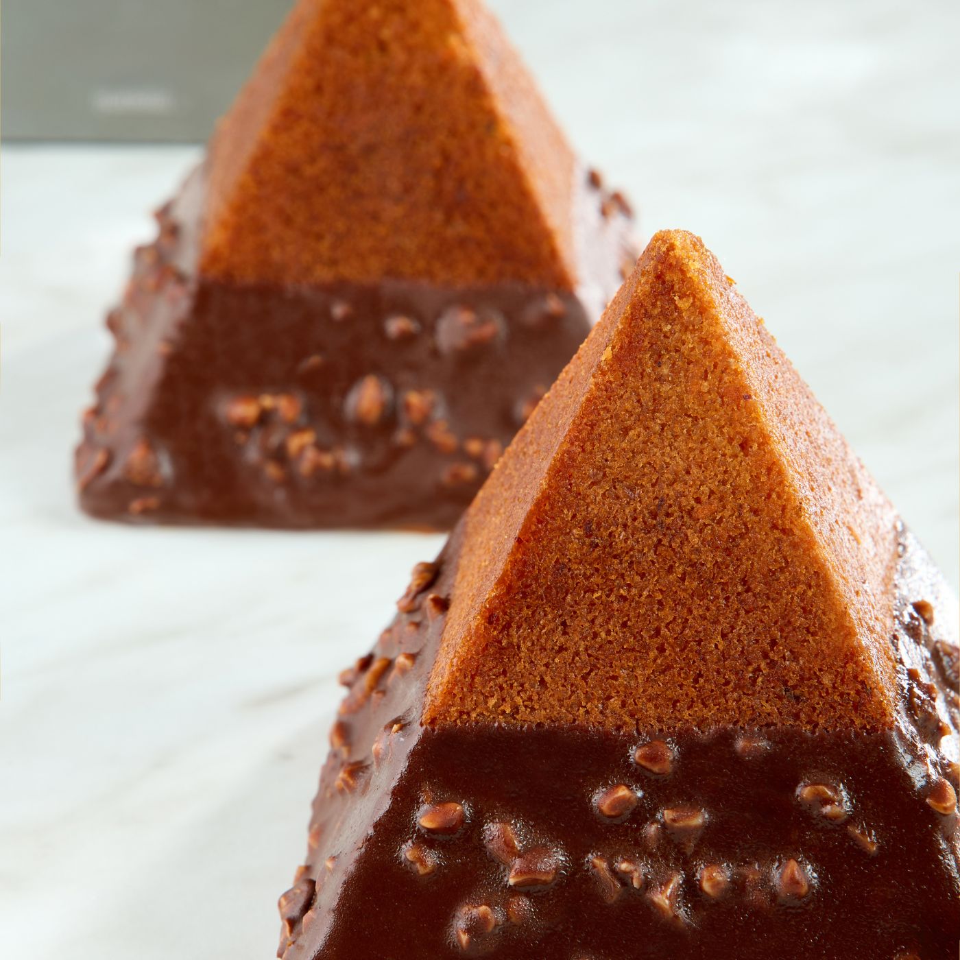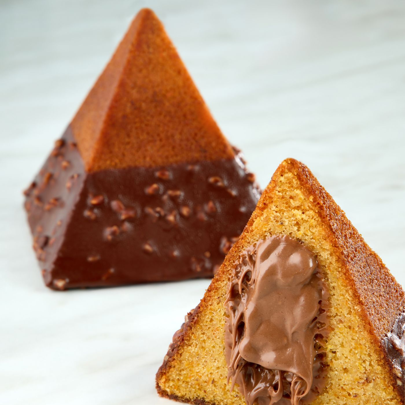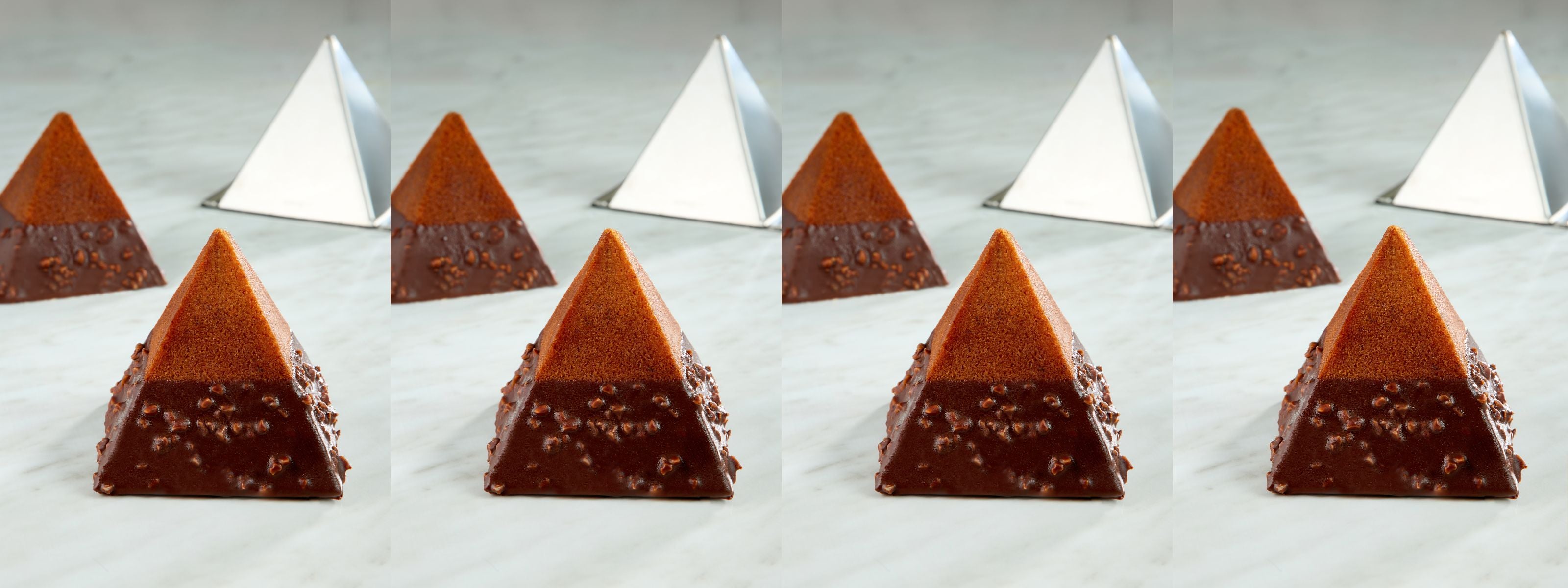 CARROT CAKE DOUGH: gratethe carrots using the cutter and drain to remove excess liquid. Place all the other ingredients in the cutter and mix until smooth. add the grated carrots using a spatula. Pour 150 g of the mixture into the pyramid mould and bake at 160°C for 15/16 minutes. leave to cool and then glaze.