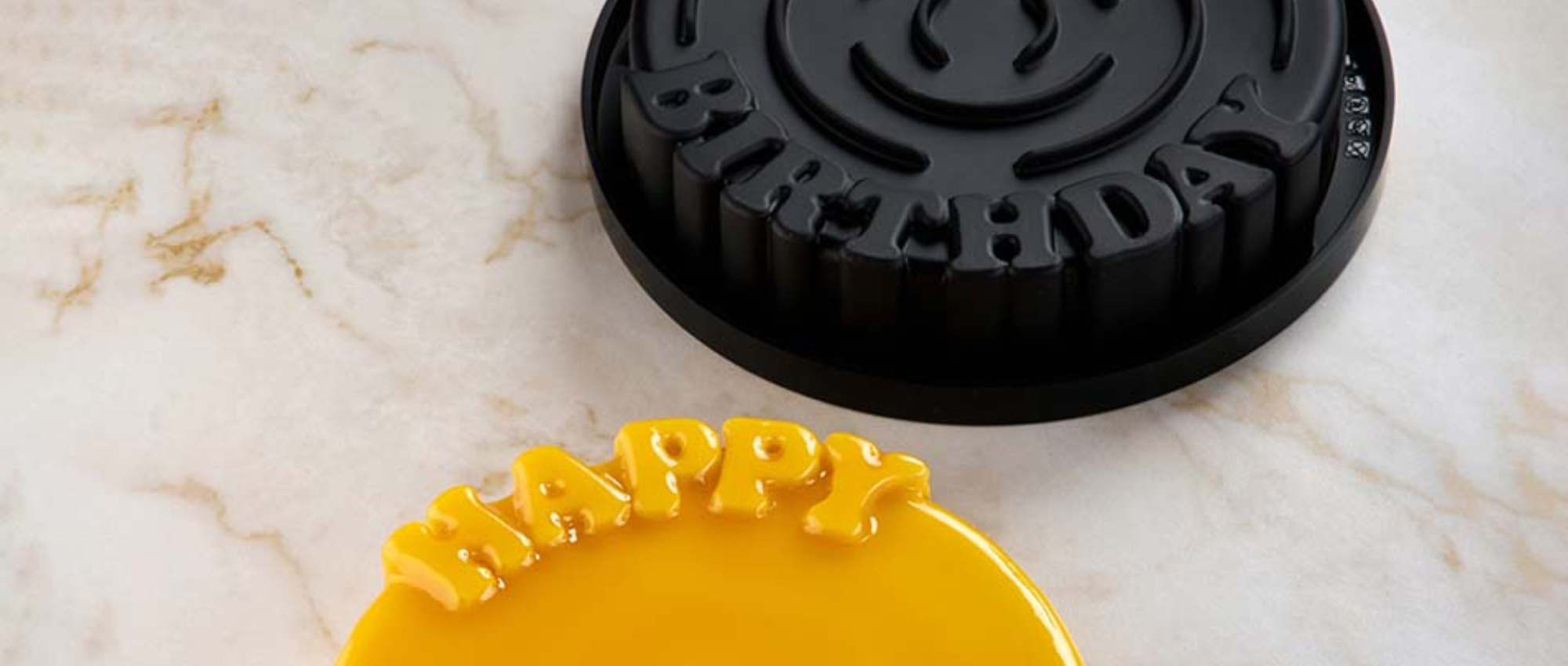 Assemble in the Happy Birthday KE096 mould. Pour in the blancmange and spread out over the bottom of the mould and the sides. Place in the blast chiller for 30 minutes. Take out the mould and add a middle layer of exotic jelly, blast chill for 15 minutes, and then add a second layer of blancmange. Finish with a top layer of pain de genes and the brittle. Blast chill for 40 minutes and drizzle with light brown Dolce Velluto DV6SB.
