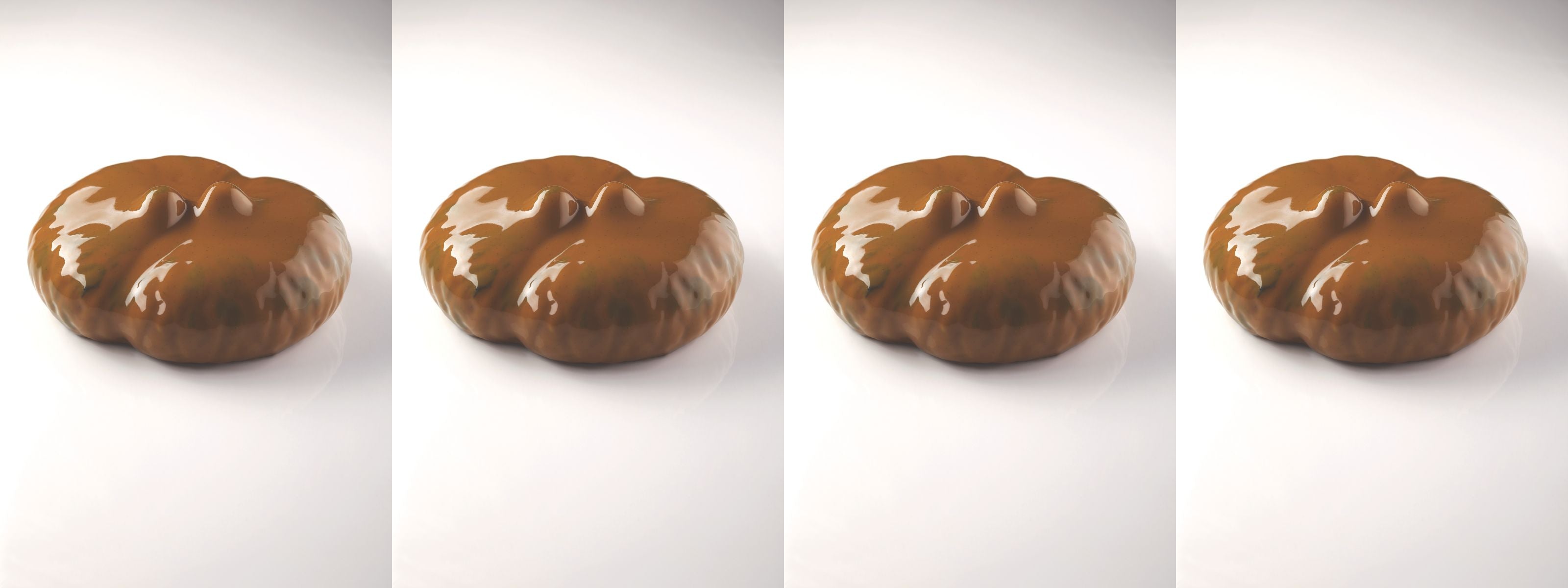 Combine all the elements inside the KE056 mould and blast freeze. Finish with the milk layer, the brushed dark chocolate for a veined effect and the caramel layer. * Beat with an electric whisk before using.
